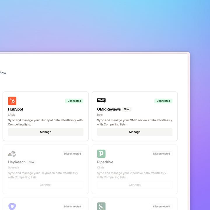 Integrations are becoming the core of what we’re building. Connecting data sources, automating outreach, making everything flow together. We just shipped integrations with HubSpot, OMR Reviews, and a few others. Watching customers connect their entire stack through Compelling has been really satisfying.